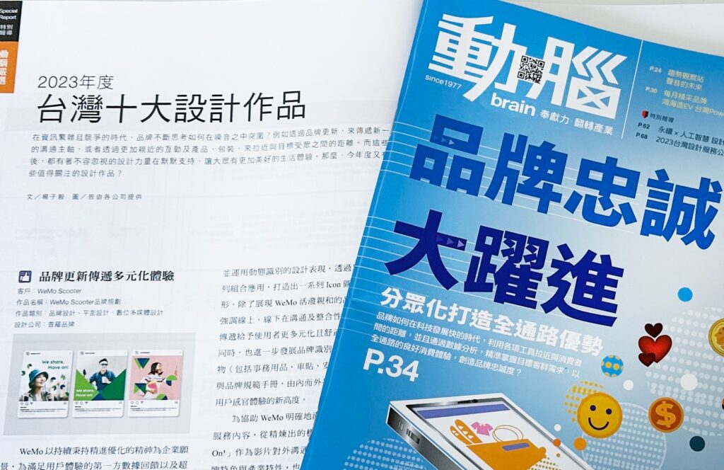 台灣十大設計作品,是《動腦》編輯部精選出過去一年以來的優秀設計作品。今年,Process 普羅品牌協助WeMo進行數位品牌優化與設計,再次獲此殊榮。