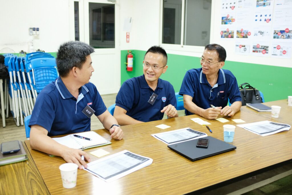 (左起)CML全懋精機副總經理朱文鈔、董事長陳衍甫與總經理 李金川討論品牌共創的過程。
