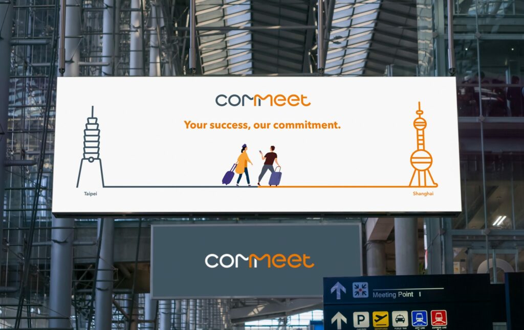「此設計亮點在於COMMEET 識別設計運用品牌名組成字Come與Meet的概念,串起商務旅行「會面」的核心需求。透過品牌識別的連結視覺表現,表達能快速透過一站式系統解決各種商務行程問題。」