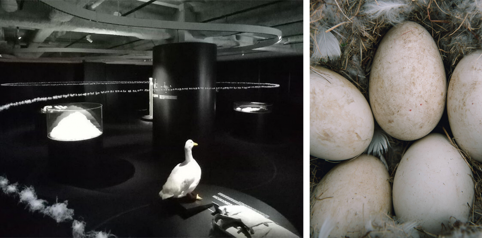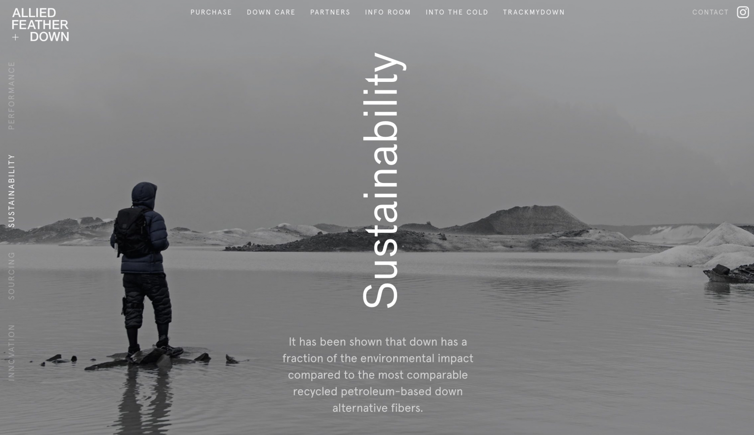 若想要靠視覺直接表達永續,一般多選用綠色等大地色系,但其實還是要看要表述的層面而定,例如羽絨原料品牌Allied Feather & Down,一直以來關注人道飼養與永續議題,不斷與客戶溝通鵝、鴨毛的來源均採人道飼養。近年羽絨產品大部分直接賣給登山服飾品牌,在B2B的商業模式中和品牌商對接時,其品牌形象從天然走向時尚風格,透過展覽溝通永續,以主題性的尋根之旅追溯羽絨故事,與自然產生關聯性,透過一直以來的風格串連永續理念。
