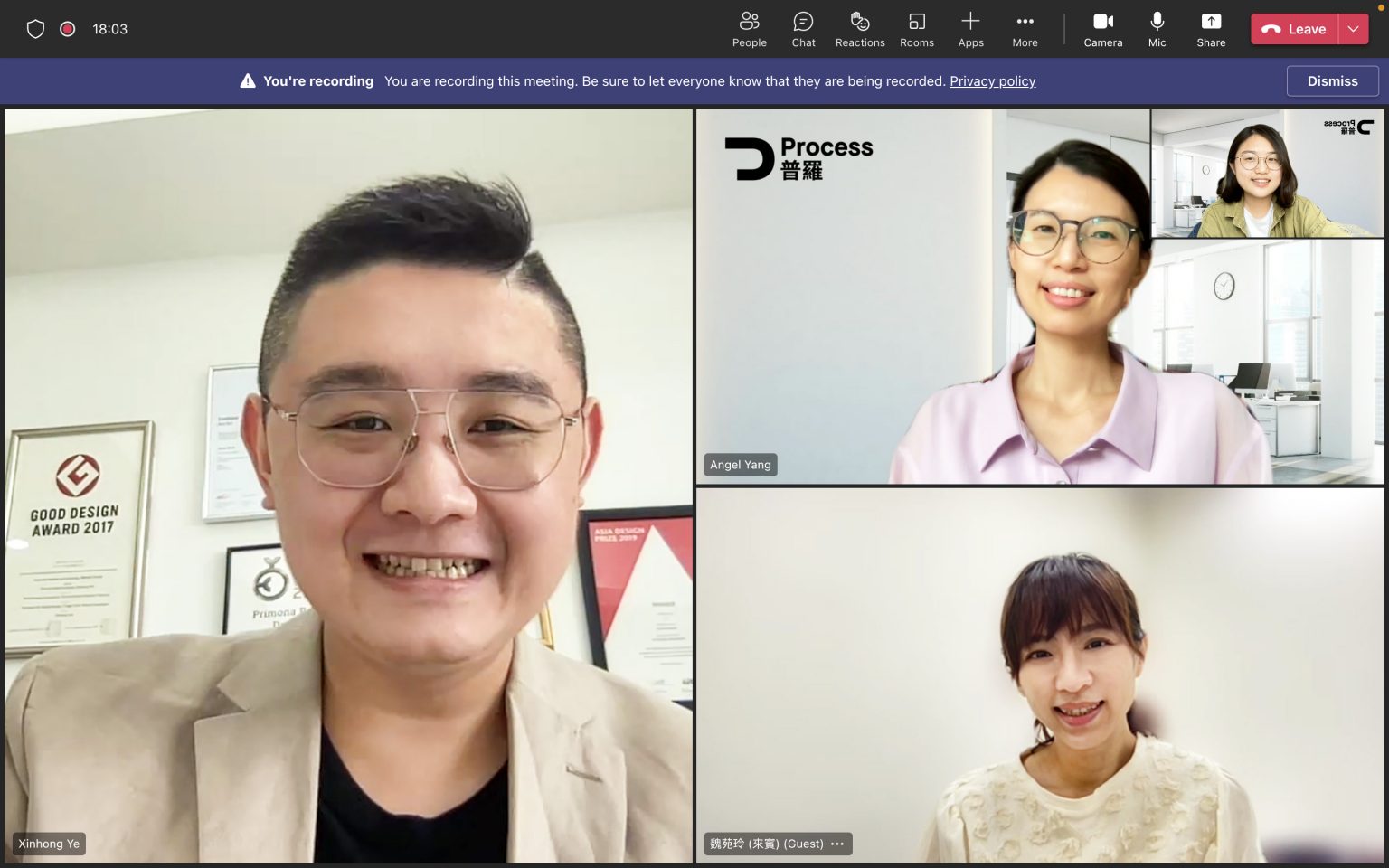 (左起)Process普羅品牌創意總監 葉信鋐、總經理 楊淑燕、採訪記者 魏苑玲共同於線上進行永續專訪的大合照。