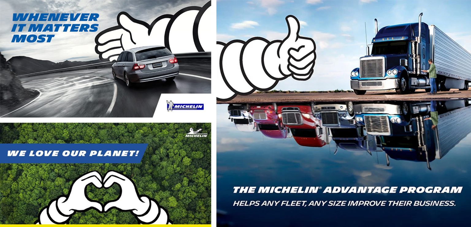 非永續原生品牌米其林輪胎,推出了「免充氣、防穿刺」的綠色輪胎,雖然無法輕易將永續精神直接表現在企業識別商標下,卻是輔以各種永續圖像與訊息傳達,在各個溝通接觸點上宣示將投入更多資源從事環保配方研發與回收技術的提升,展現品牌決心。
