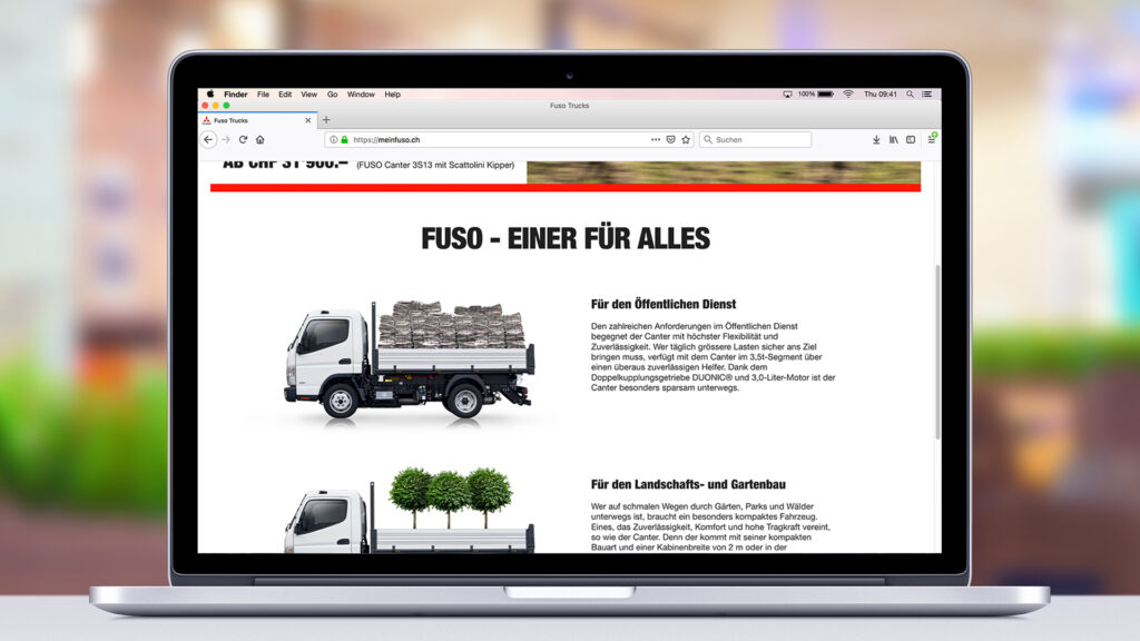 FUSO 是Mercedes-Benz Trucks Schweiz AG 的品牌,是一款全方位的運輸工具,非常適合社區、園林綠化和園藝以及建築行業使用。