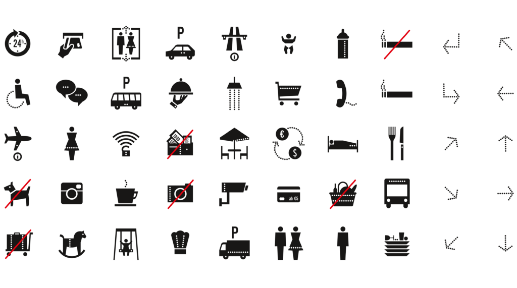 我們發展了一整套圖標。創建了一個清晰易懂,佐以簡單的箭頭的作為指導系統。整體設計基於主要字體 Alternate Gothic No. 2,並將品牌設計中的虛線作為重複使用的元素。