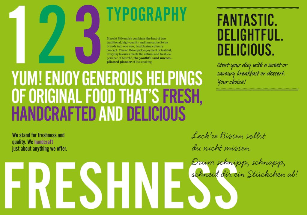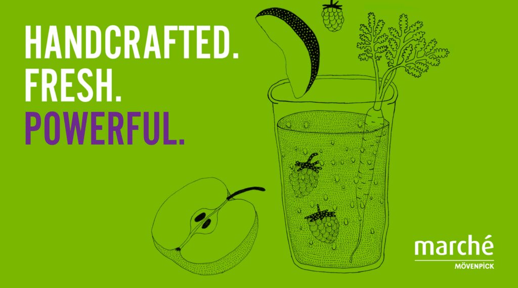 與攝影師 Klaus Einwanger 合作創作,豐富多彩的食物圖像傳達了Marché Mövenpick美食的大器、精緻和市場新鮮度。 與此同時Klas Herbert的插圖等俏皮有趣的元素也突出了“手作坊“的感覺。