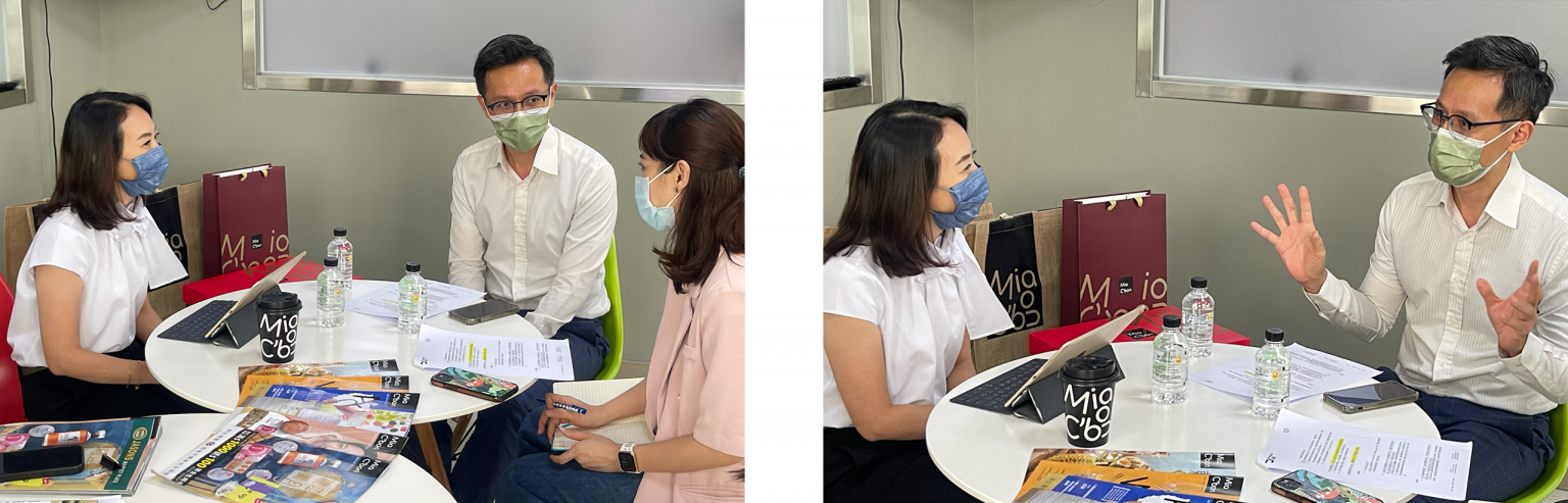 (左圖左1起) Mia C’bon行銷部總監 黃琪芬(Sophia Huang)、 (中)Process普羅品牌台灣分公司榮譽顧問 李國榮(Jules Li)、(右)採訪記者 魏苑玲平面採訪的畫面。