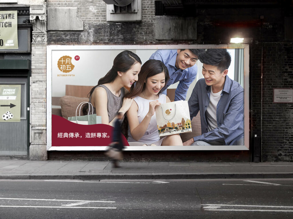 全新的品牌標誌中也進一步延伸到品牌輔助圖形的應用上。我們從品牌標誌中提取了“餅香環繞”的概念,將餅食香氣流動四溢的感官形象化。這一輔助圖形將整合應用於所有的品牌溝通渠道及應用物中,讓十月初五的品牌形像從視覺上形成一種更完美的連貫性、統一性。