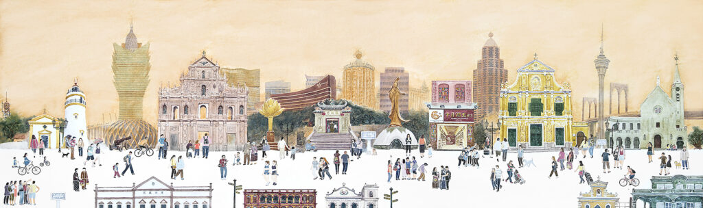 插畫通常會比照片更有力地表達品牌的個性和視覺特徵,因此我們邀請澳門本土知名插畫師梁達鴻為品牌發展了一套全新的澳門插畫。運用現代水彩畫的技法,將澳門標誌性的建築融合在街景長卷中,澳門迷人的城市風情與鮮活的生活記憶都盡現於此。