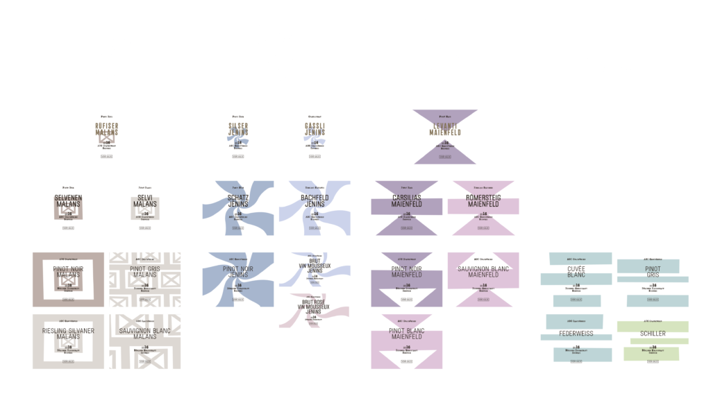因此,個別葡萄酒品種和定價組的分類醞釀了簡單卻真實的圖形組合。 最重要的是:即使每個瓶身都是獨一無二的,von Salis 葡萄酒系列卻能展現出各種排列組合的和諧度。